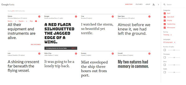 Google Fonts目前已拥有809种字型,提供线上预览让您即时浏览任何想输入的文字,并可自由选择字体大小与粗斜体等变化的预览效果,也可下载于私人电脑观看,这让网站建设师能不再侷限于系统内建字型,使用者也不必再安装该字型档案,便可享受最原始的设计,所以了解Google fonts的使用,对网站建设师来说绝对是一绝佳利器。