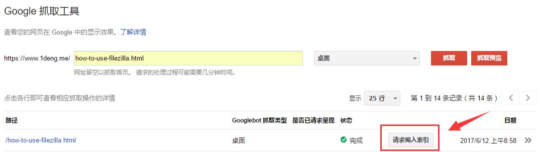 在网址栏中输入你需要收录的页面URL,然后点击抓取,抓取完成之后,点击请求编入索引。
